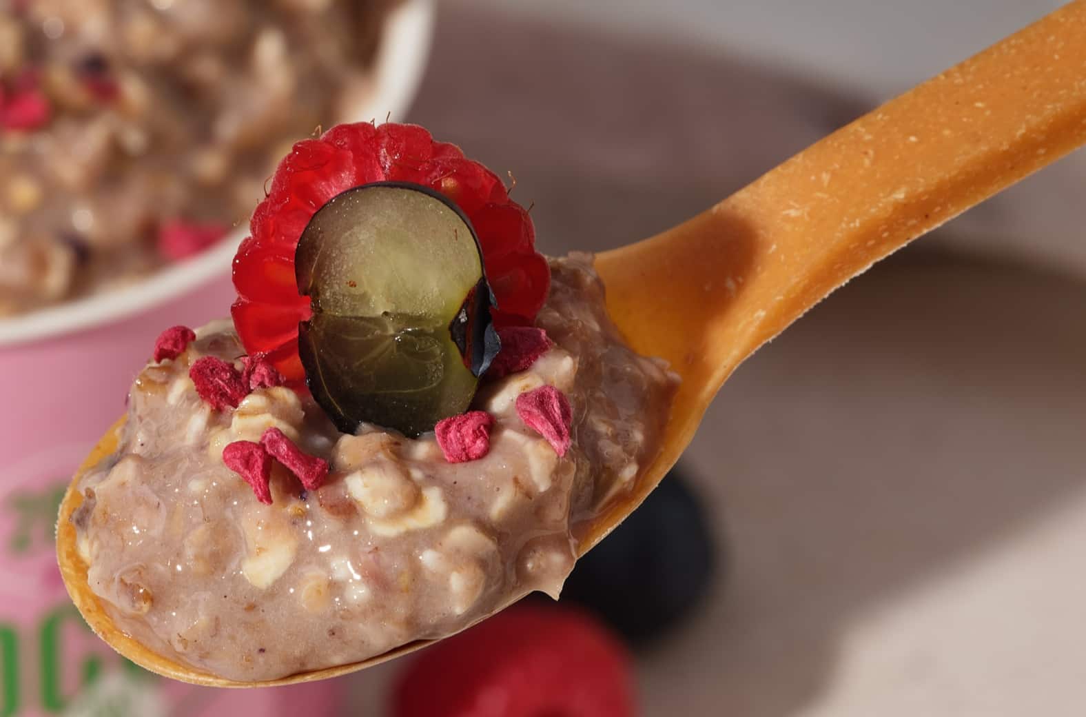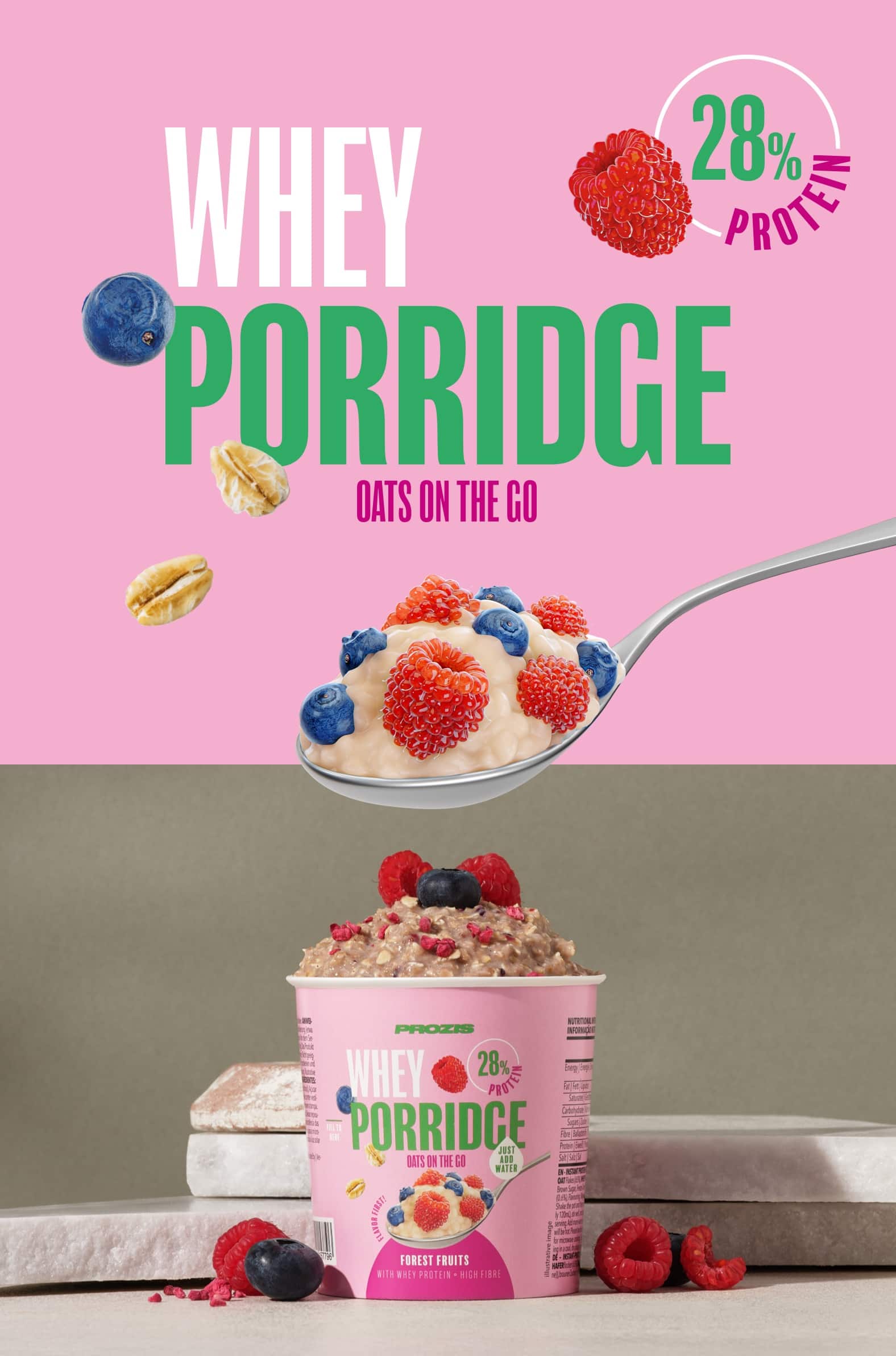 Ricas en proteínas y deliciosasDepending on the flavor you choose, there’s 13–19 g of protein in each pot. Unlike regular oats, Prozis Whey Porridge Oats-on-the-go is enriched with high-quality whey protein. What is whey protein? It’s a complete protein, which means it contains all nine essential amino acids—including the three branched-chain amino acids (BCAAs): leucine, isoleucine, and valine. In a nutshell, Prozis Whey Porridge Oats on-the-go, high in protein and fiber, is the ideal meal for health-conscious people. Get your share of oats! Protein helps support the growth and maintenance of muscle mass.