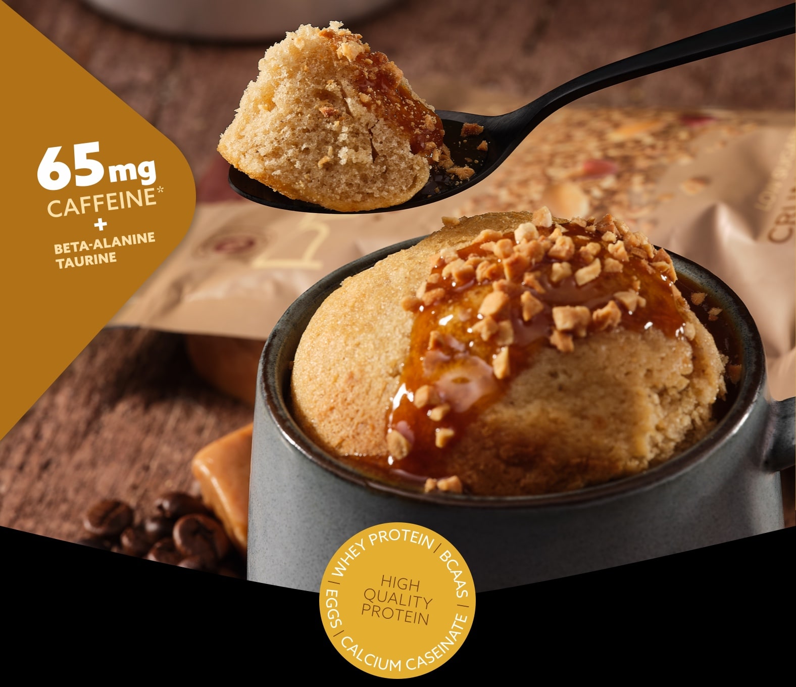 Harina de TRIGO (24%), Fructo-Oligosacáridos, Humectante (Maltitoles), Humectante (Eritritol), HUEVO entero en polvo (9,3%), Triglicéridos de cadena media en polvo (Triglicéridos de cadena media, Almidón modificado, Maltodextrina , Antiaglomerante (Dióxido de Silicio), Emulgente (Monoglicéridos y Diglicéridos de Ácidos Grasos)), Almidón, Péptidos de colágeno, Aislado de PROTEÍNA DE SUERO de LECHE (4%), Caseinato de calcio (2%) (LECHE), Aromas, Preparado en Polvo a Base de Aceite de Coco (LECHE), beta-Alanina, BCAA en polvo (L-Leucina, L-isoleucina , L-valina , Emulgente (Lecitinas)), Cafeína anhidra, Taurina , Óxido de magnesio, Clorhidrato de Piridoxina, Nicotinamida, Preparado de Levadura, Proteína de TRIGO, Sal, Emulgente (Lecitinas), Colorante (Caramelo de SULFITO Amónico), Café Instantáneo Descafeinado (0,6%) .