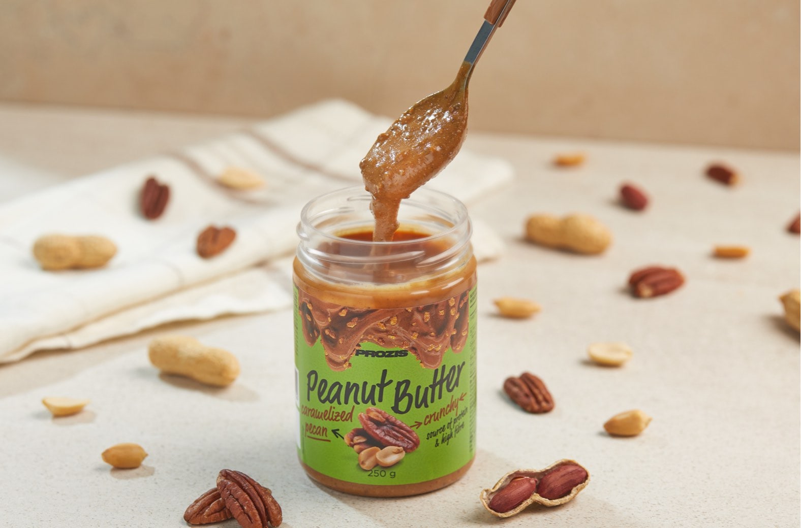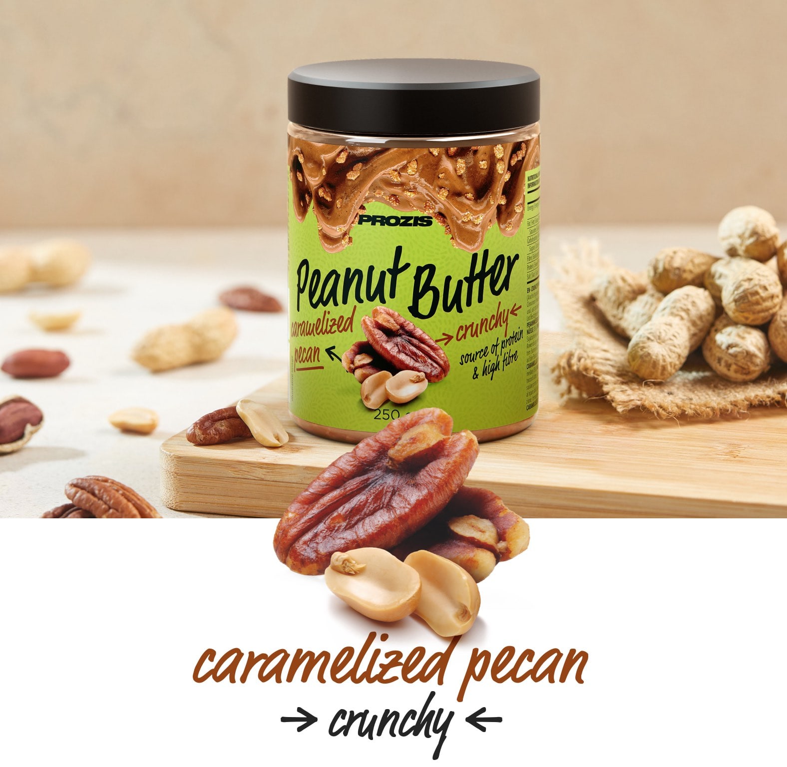 Η καραμελωμένη αλοιφή πεκάν για ένα υπέροχο σνακ!Το Prozis Caramelized Pecan Peanut Butter είναι μια φυσικά νόστιμη αλοιφή. Εκτός από το ότι είναι μια υγιεινή πηγή πρωτεΐνης και λιπαρών οξέων, τα φιστίκια παρέχουν επίσης μια σημαντική ποσότητα ινών και άλλων συστατικών. Χάρη στη συνολική θρεπτική του σύνθεση και τη συνταγή του που δεν περιέχει γλυκαντικά, υδρογονωμένα έλαια και τεχνητές γεύσεις, το Prozis Caramelized Pecan Peanut Butter είναι μια εξαιρετική επιλογή για όσους απαιτούν μόνο την καλύτερη διατροφή.