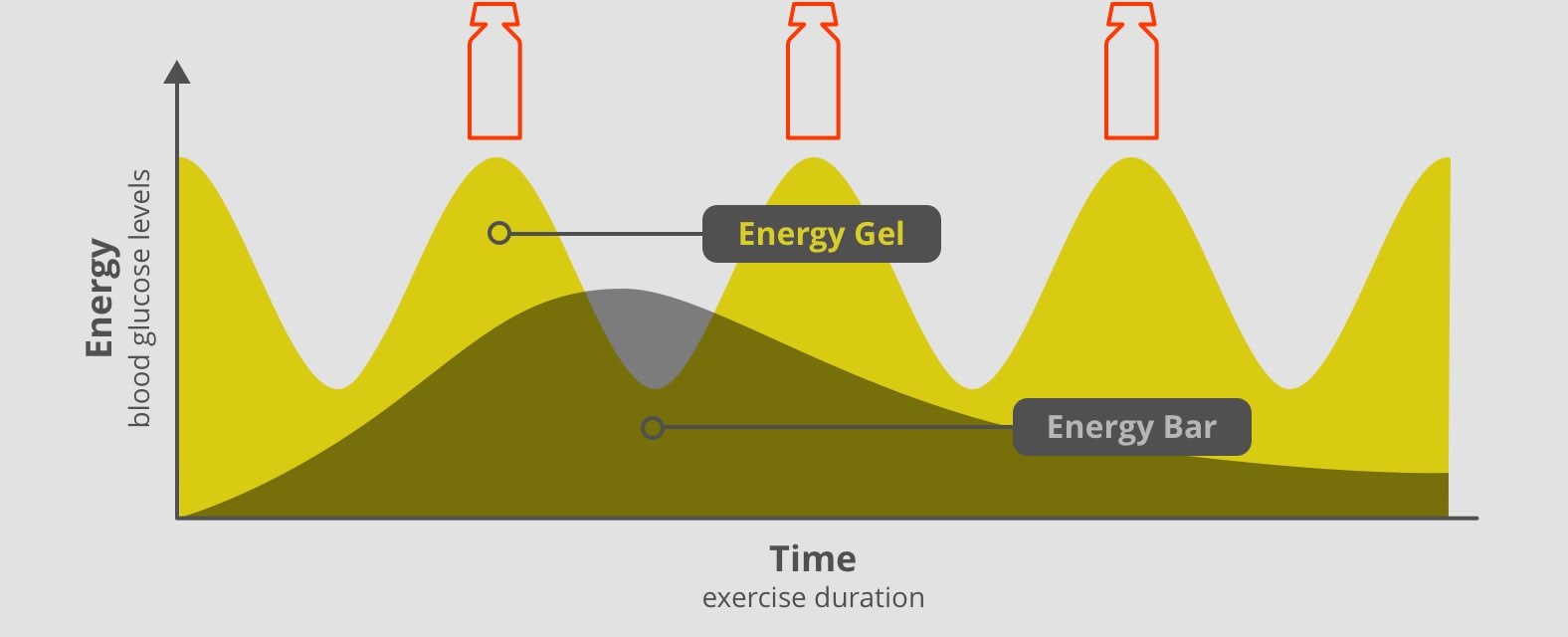 Lade deine Batterien aufDas Prozis Energy Gel liefert dir schnell verwertbare Kohlenhydrate — eine effektive Kohlenhydratlösung, die deine Leistung steigert* und dir genau dann Energie liefert, wenn du sie brauchst. Kohlenhydrate sind die Hauptenergiequelle bei intensiver Belastung und Ausdauertraining, sei es beim Laufen, Mountainbiken oder Fußballspielen. *Kohlenhydratlösungen tragen zur Aufrechterhaltung der Ausdauerleistung bei intensiver und lang andauernder körperlicher Betätigung bei trainierten Erwachsenen bei. Die positive Wirkung stellt sich nur ein, wenn trainierte Erwachsene über mindestens 60 Minuten bei hoher Intensität (mindestens 65% VO₂max) trainieren. Energie, wann du sie brauchstDer Energiebedarf schwankt während des Trainings. Die folgende Grafik zeigt, wie sich Energy Gels und Riegel unterschiedlich auf den Blutzuckerspiegel auswirken. Während Riegel eine gleichmäßigere und länger anhaltende Energie liefern, sorgen Gels für einen schnellen Energieschub — ideal während des Trainings oder bei hoher Belastung. ** Wenn es auf schnelle Energie ankommt, geht nichts über ein Energy Gel.
