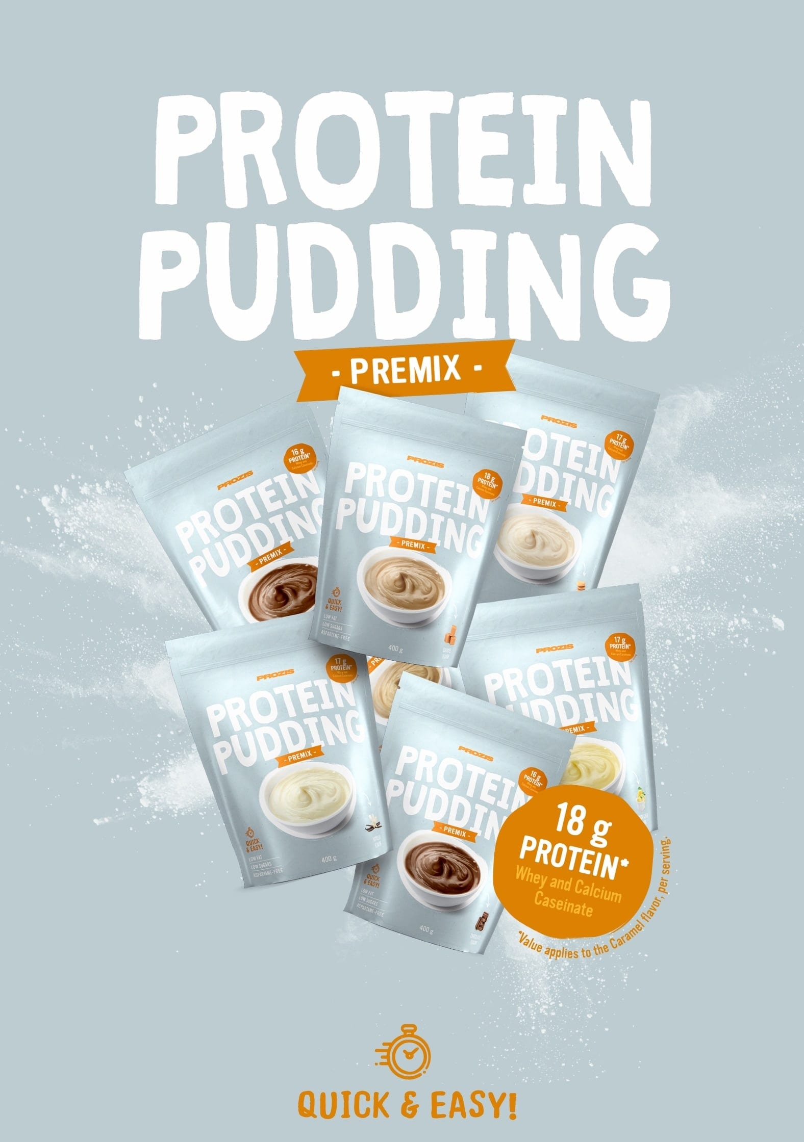 Pudding Premix for a Protein FixProzis Protein Pudding Premix is a delicious and convenient way of ingesting protein. But, apart from its nutritional advantages, this protein pudding premix is also very easy to prepare, allowing you to treat yourself effortlessly and indulgently. As it is low in sugars and fat, you don’t have to worry about that guilty aftertaste. Mix up your day, or surprise your family and friends with some Pudding love. With different flavors available, your desserts will never be boring again! High ProteinLow FatLow SugarsAspartame-Free